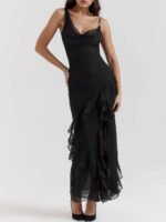 Introducing our Black Ruffle Maxi Dress. a timeless piece that effortlessly combines elegance and style. This dress is designed to empower you with confidence. featuring a flattering silhouette and dramatic ruffle details.